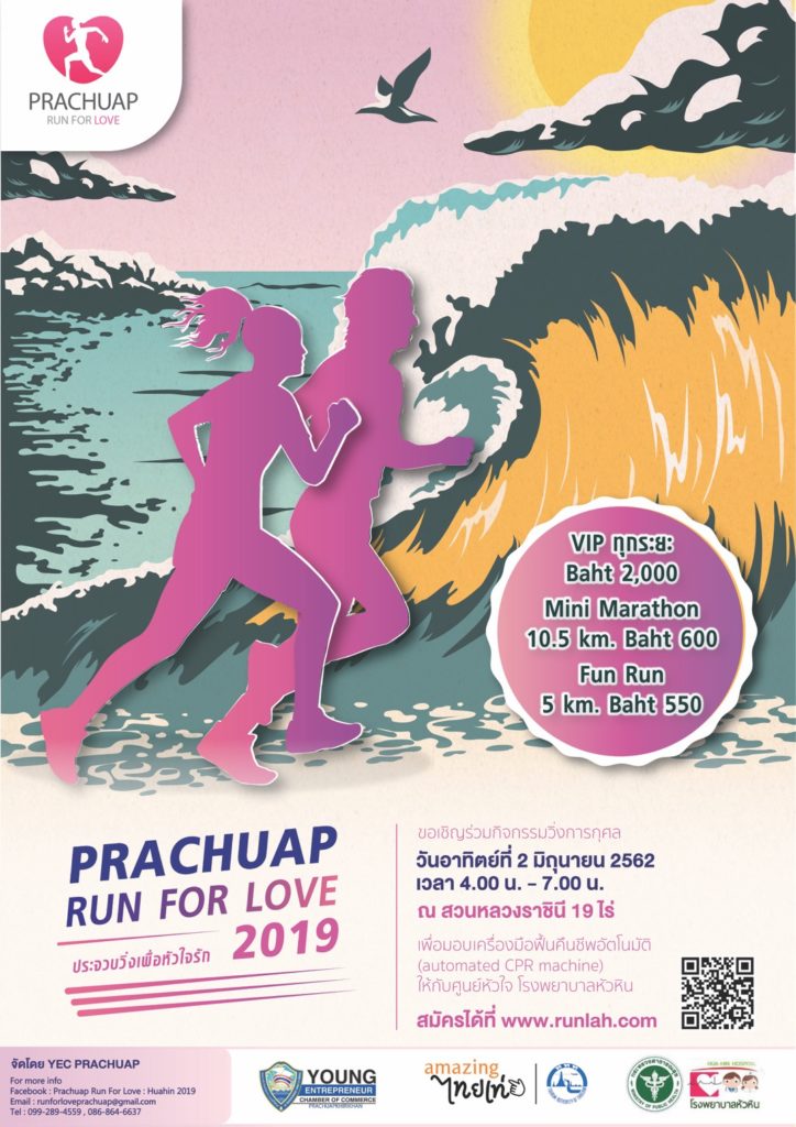 "WHERE DOES MY DREAM TAKE ME TO?"TO FIND MY MIND? TO FIND ANOTHER LIFE?TO COMPLETE A CHALLENGE?OR TO BE ALIVE?PRACHUAP Run for Love : ประจวบวิ่งเพื่อรัก 2019ณ สวนราชินี 19 ไร่ ในวันอาทิตย์ที่ 2 มิถุนายน 2562 >รายได้หลังหักค่าใช้จ่าย นำไปจัดซื้อเครื่องมือฟื้นคืนชีพ อัตโนมัติ (automated CPR machine) ให้กับศูนย์หัวใจ โรงพยาบาลหัวหินจัดโดย YEC PRACHUP>ประเภทการแข่งขัน- VIP Mini Marathon และ Fun Run >>>>> 2,000 บาท- Mini Marathon 10.5 Km. >>>>> 600 บาท- Fun Run 5 Km. >>>>> 550 บาท>🔴สามารถสมัครผ่านระบบออนไลน์ได้เลยที่https://www.runlah.com/events/c/prfl19 📞ผู้จัดการแข่งขัน : 099-289-4559 / 086 864-6637#PrachuapRunForLove #HuahinRunForLove